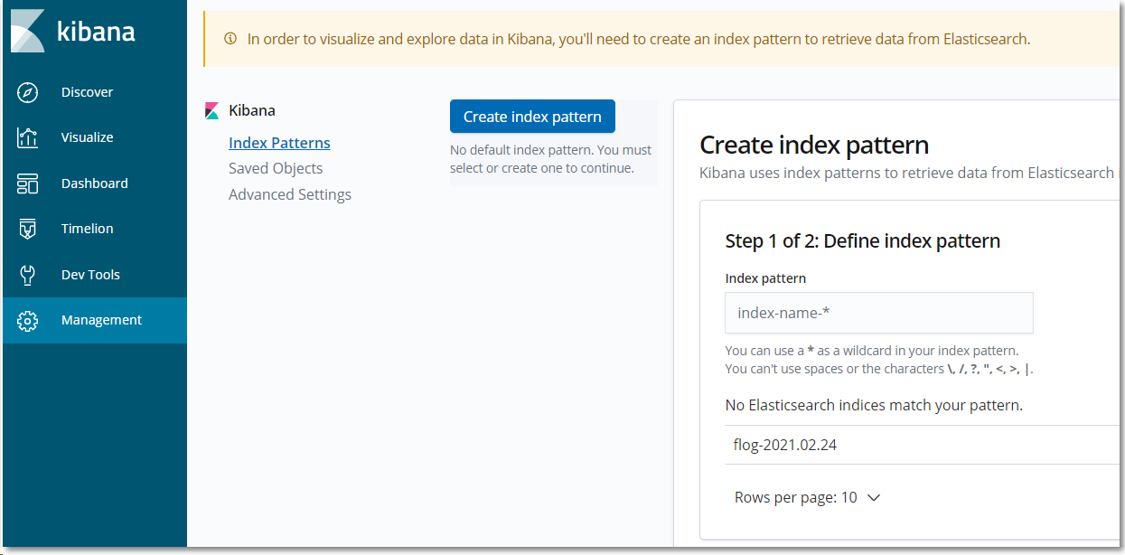 아래와 같이 flog-*에 @timestamp를 time filter로 하는 index pattern을 생성하게 되면