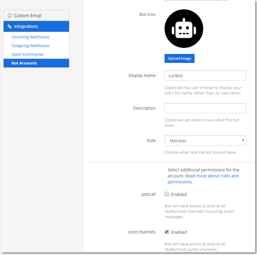 Bot Accounts에서 Display Name과 role, post:all, post:channel 등을 선택하자.