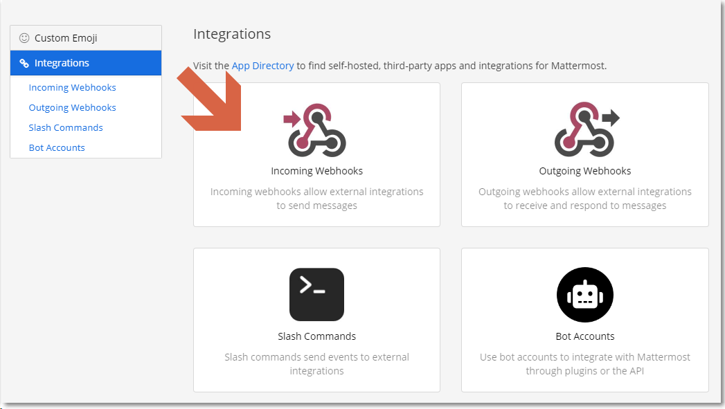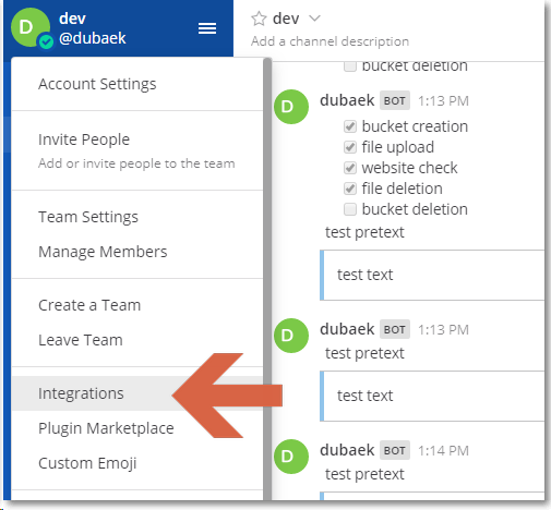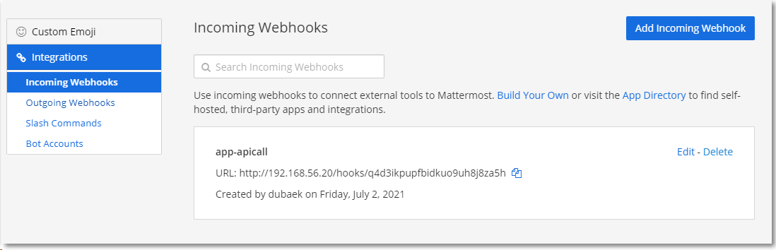 Mattermost App이나 Web Browser에서 Integrations 메뉴로 이동한다.(로그인된 사용자는 관리자 권한이 있어야 한다.)