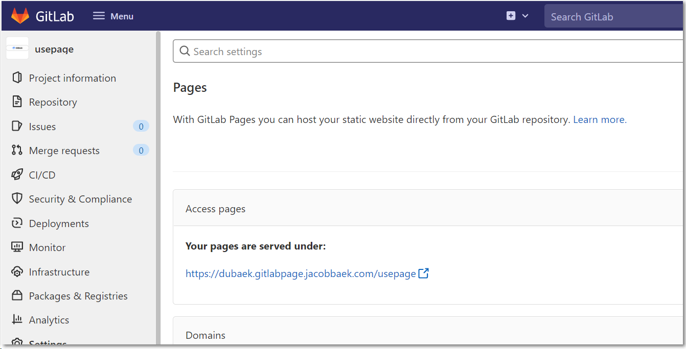 또한 별도의 도메인이 필요하다. 기본적으로 GitLab 접근시 gitlab.example.com을 사용중이었다면 pages는 다른 도메인이어야 하며 wildcard DNS record를 사용해야 한다. (또한 기존 GitLab domain과 의존성이 있으면 안되기에 아래 링크를 통한 규칙을 확인하여 domain을 사용하자.)