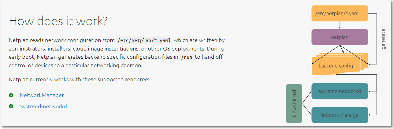 갑자기 systemd가 나온다. 이유는 netplan은 기본적으로 아래와 같이 상단에서 systemd-networkd (혹은 NetworkManager)에서 실행될수 있는 backend file을 생성하게 된다.