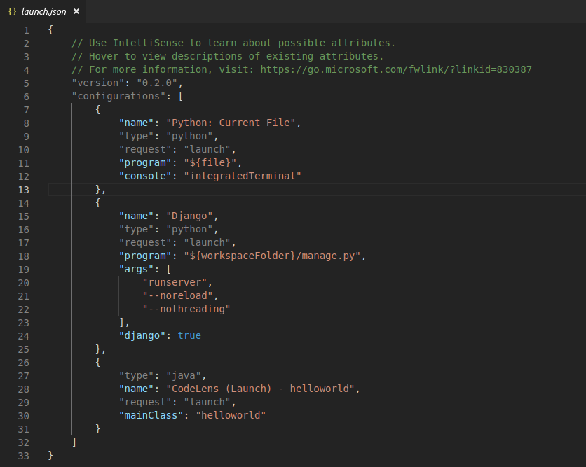 아래와 같이 launch.json 파일을 확인해 볼수 있다. (Ctrl + Shift + D 로 이동후 좌측상단에 바퀴모양 클릭)
