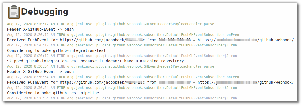 위와 같은 log가 github webhook이 발생될때마다 출력되게 된다.