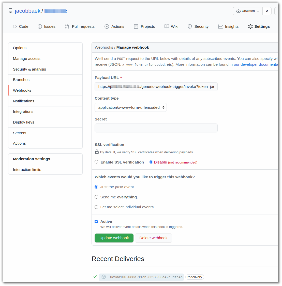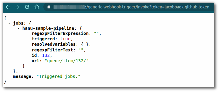https://JENKINS\_URL/generic-webhook-trigger/invoke?token=jacobbaek-github-token 이런식으로 호출하면 된다.