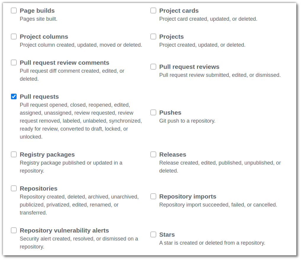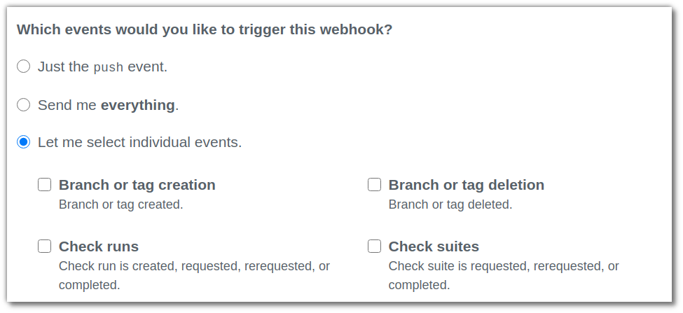 참고로 Github Webhook은 다양한 event를 선택하여 webhook을 호출할수 있으며 다음과 같은 선택을 Github의 webhook 메뉴에서 할수 있다.