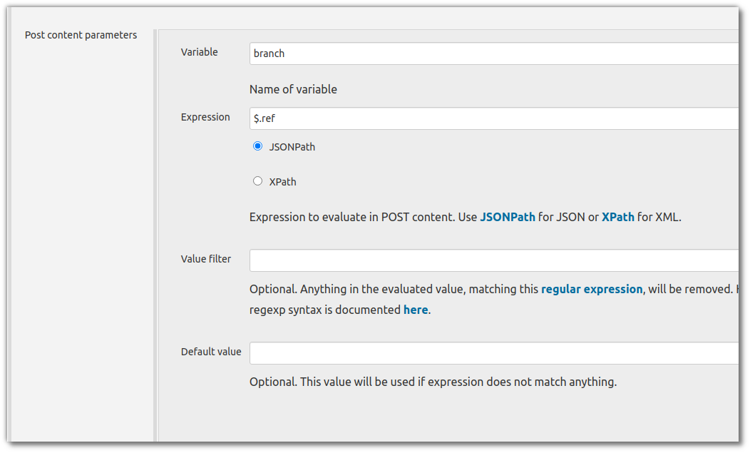또한 expression은 $.ref와 같이 지정한다. ref가 branch를 의미한다. (뒤에서도 나오겠지만 ref 항목에