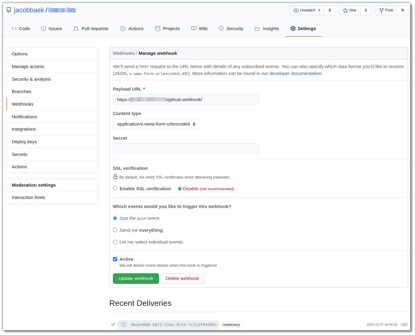 이때 정상적으로 webhook 호출이 안되는 경우는 이유를 확인 및 해결하고 최하단에 보이는 실패된 delivery를 클릭하여 들어가 redelivery를 수행해보면 다시 webhook 호출을 수행하기 때문에 이를 통해 확인할수 있다.